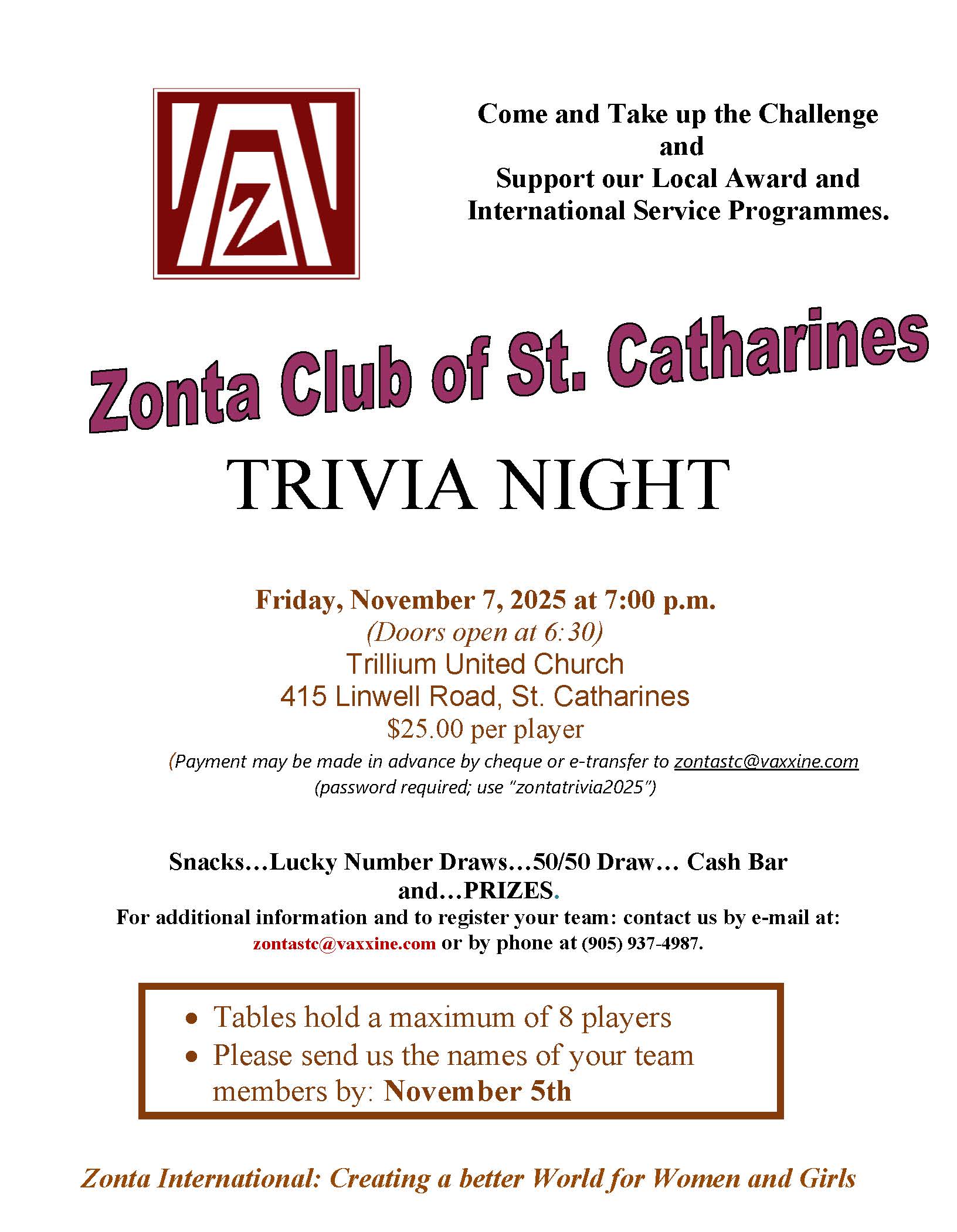 The Zonta Club of St. Catharines was established in 1929 and is in District 4 Area 3. Members actively support organizations and individuals that assist women and children locally and abroad. Our club makes a difference by addressing various women’s issues including health, education, poverty, employment, security and much more. Our club meets the third Monday of every month from September to June at Johnny Rocco’s Italian Grill, 271 Merritt Street, St. Catharines.