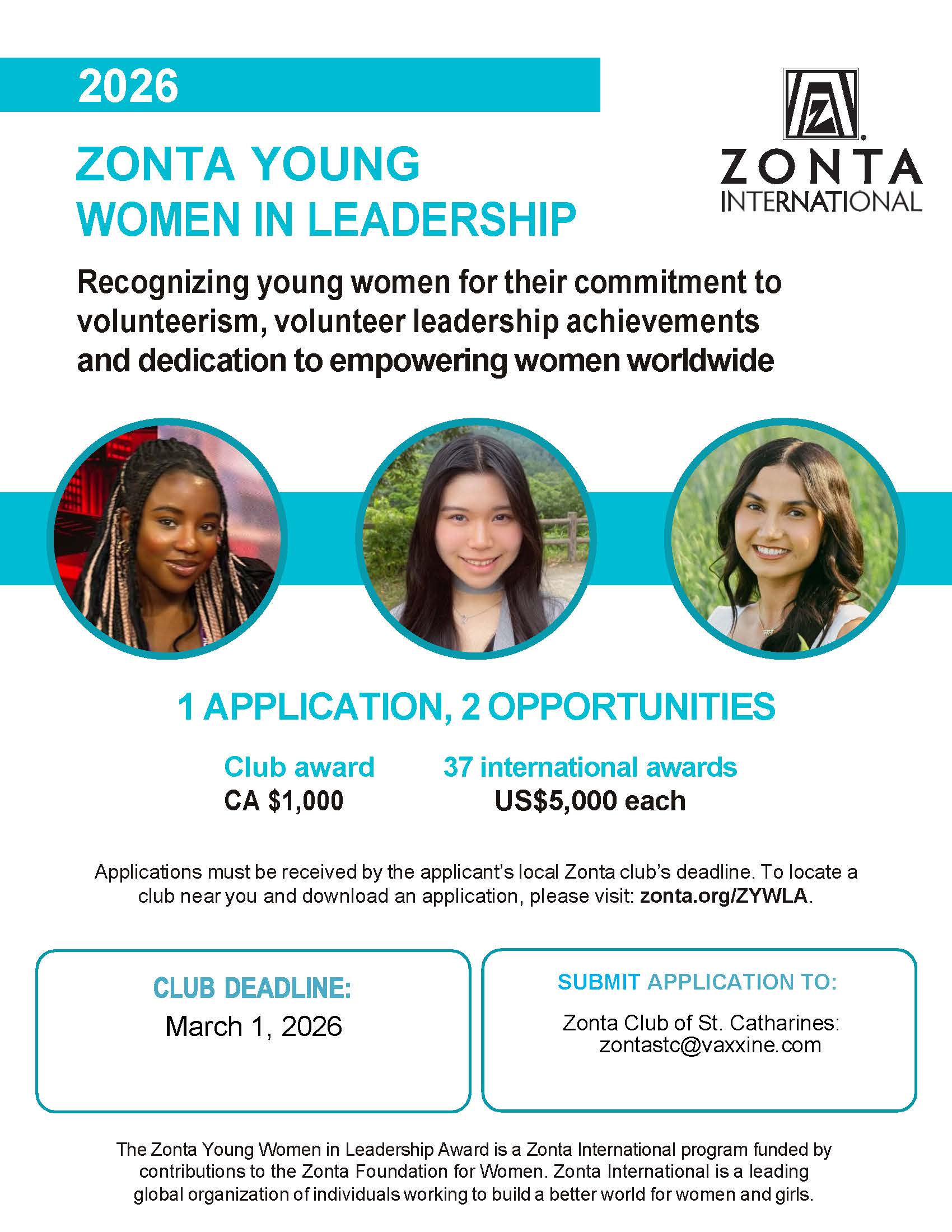Welcome to our web site. Here you will find our major goal reflected: to improve the legal, political, economic, educational, health and professional status of women at the global and local level through service and advocacy. We are part of a world fellowship of members promoting justice and universal respect for human rights, and we dedicate our efforts to implementing service programmes that improve our local and global communities. That can be through fundraising to support agencies and non-profits doing vital work to help St. Catharines’ residents be safely housed, and well-nourished, to help young women realize their dreams of being well-educated, to prevent gender-based violence and counter its effects on the victims and their families. It also can be through gathering and donating necessary supplies. The same themes permeate the current projects of Zonta International which include four different scholarship programmes, and through UN Women, assistance to young girls in Madagascar to keep them in school, the fight to eliminate child marriage, assistance to survivors of Gender Based Violence in Papua-New Guinea and Timor -leste, and protection for adolescent girls in Peru through timely health care and preventing violence in schools. The Zonta Club of St. Catharines is a cohesive team, committed to working together to make progress on all these fronts. It is engaging and challenging work, and we welcome new members with the desire to contribute their time and skills. I invite you to look at the Membership page, contact us, and arrange to join us for a meeting to see why I am proud to be the President of the Zonta Club of St. Catharines.